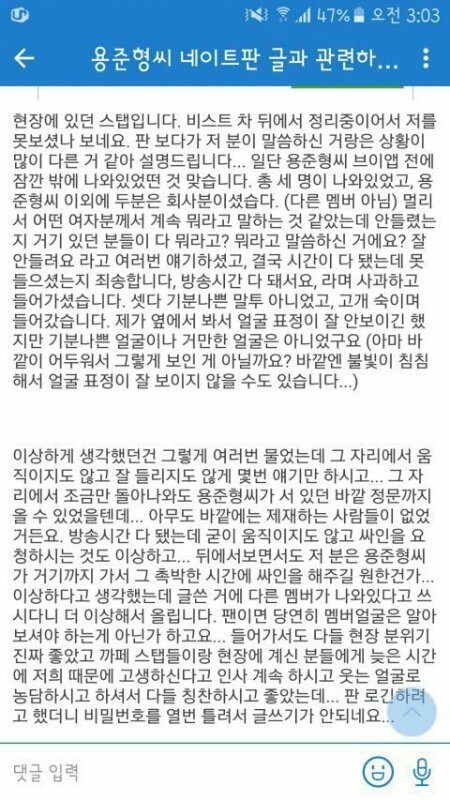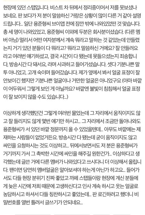 사진찍고 사진을 기재하는 시간을 1분이라고 쳐도 용준형은 50분에 담배를 피러 나갔다가 다시 들어와서 마이크를 차고 단체사진을 찍었다는건데 용준형이 홍길동이 아닌이상 불가능