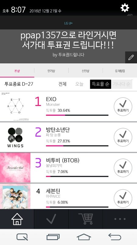 우리 투표랑 순위 쪼끔만 신경쓰자!ㅠㅠㅠㅠ내려가고있는데 콘서트때문에 묻히는것같아..콘서트땜에 심란하고 초조할거 알지만 이삐톡으로 가줬으면해!나같이 콘서트안가는 이삐들은 순위 신경쓰면서 티켓팅 잘되길 응원하고있을게 파이팅♡