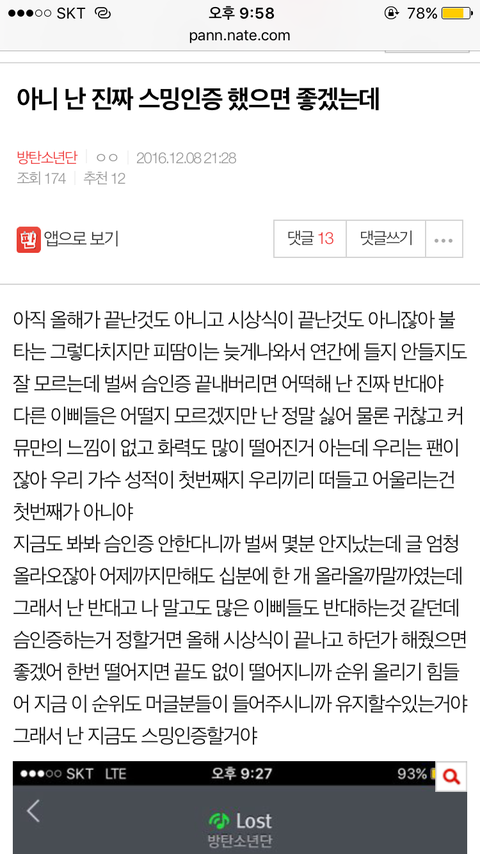 요즘 음원강자분들 많이 나오시기도 했고, 우리 순위가 조금 많이 말도 안됨 그러니까 다시 스밍인증을 하던, 투표인증을 하던 했으면 좋겠음은 내 생각