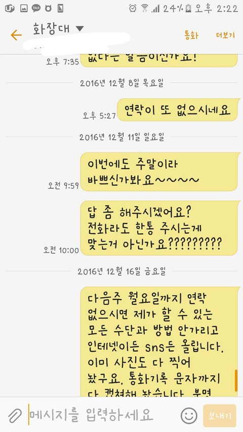 밑에 사진은 그 팀장이라는 분이랑 주고 받은 문자랑 전화 한통도 안 받은 내역^^ 등 증거사진들임