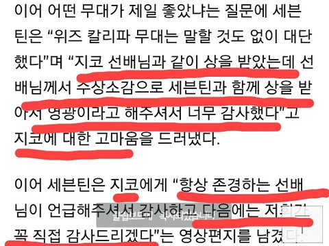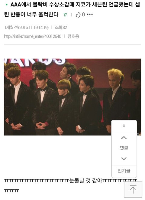 그 글 댓 ㅎㅎ 심지어 셉틴분들 수상하실때 웃으면서 박수쳐주면서 엄지도 올림 지코가 셉틴분들 언급했을 때 같은 멤버 블락비 박경도 웃으면서 고개 끄덕임