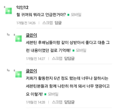 유튭에서도 서로간의 친목영상이 많고 서로 보기 훈훈한 친목중임 갠적으로 두그룹 모두 좋아하는 사람으로서 물타기 선동 등을 보면 맴이 아픔 오해하셨던 분들 오해풀리길 바라며 20000 셉틴분들캐럿분들 사룽해여 꿀벌들도낙지들도 ~~♥