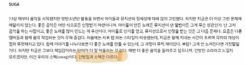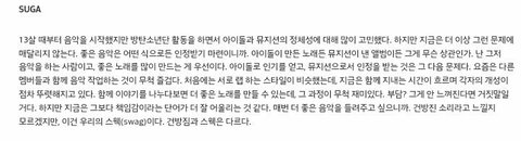 13살 때부터 음악을 시작했지만 방탄소년단 활동을 하면서 아이돌과 뮤지션의 정체성에 대해 많이 고민했다. 하지만 지금은 그런 문제에 매달리지 않는다. 좋은 음악은 어떤 식으로든 인정받기 마련이니까. 아이돌이 만든 노래든 뮤지션이 낸 앨범이든 그게 무슨 상관인가. 난 그저 음악을 하는 사람이고, 좋은 노래를 많이 만드는 게 우선이다. 아이돌로 인기를 얻고, 뮤지션으로서 인정을 받는 것은 그 다음 문제다. 요즘은 다른 멤버들과 함께 음악 작업하는 것이 무척 즐겁다. 처음에는 서로 랩 하는 스타일이 비슷했는데, 지금은 함께 지내는 시간이 흐르며 각자의 개성이 점차 뚜렷해지고 있다. 함께 이야기를 나누다 보면 더 좋은 노래를 만들 수 있는데 그 과정이 무척 재미있다. 부담? 그게 안 느껴진다면 거짓말일 거다. 하지만 지금은 그보다 책임감이라는 단어가 더 잘 어울리는 것 같다. 매번 더 좋은 음악을 들려주고 싶으니까. 건방진 소리라고 느낄지 모르겠지만 이건 우리의 스웩(swag)이다. 건방짐과 스웩은 다르다.