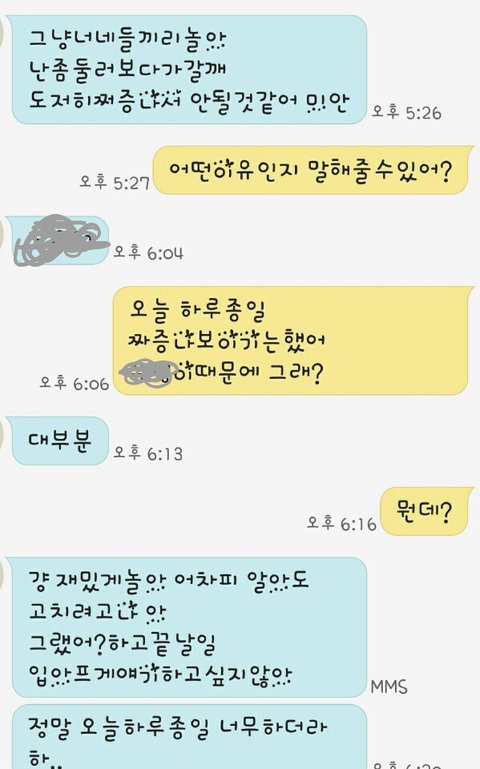교에서부터 기분이 매우 똥씹은듯 이상햇음 학교에서부터 우리는 눈치밥먹어가면서 시내에서 친구가 올때까지 기다렷음 친구들이오고 우리는 반갑게 인사를하고 분위기가 화기애애한데 B혼자 똥씹은채 앉아있음 친구들은 B가 기분이 안좋은걸 알아채고 전체분위기가 갑자기 침묵이흐름 그래서 분위기 전환좀 할겸 돌아다닐려고 나왓는데 지혼자 얘기도 없이 혼자 돌아다님 우리는 따라갓는데지 옷사러 옷가게를 감 우리는 지 옷사러 같이 따라가줬더니 지혼자 뭔가 맘에안들엇나봄 지혼자 나감 그래놓고 A한테 문자가옴 "그냥 너네들끼리놀아 난좀 둘러보다갈게 도저히 짜증나서 안될것같아 미안" 이렇게 온거임 애들다 멘붕왓지 친구생일 축하해주려고 온날에 이렇게 지가 분위기를 눈치없게 깻으니... 그래서 A가 "어떤이유인지 말해줄수있어?" 이렇게 보냇음 근데 얘가 나를 갑자기 언급하는거임