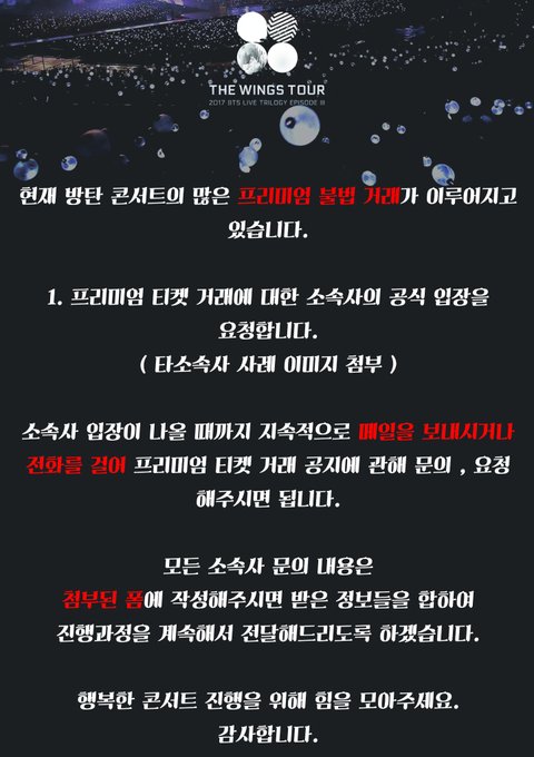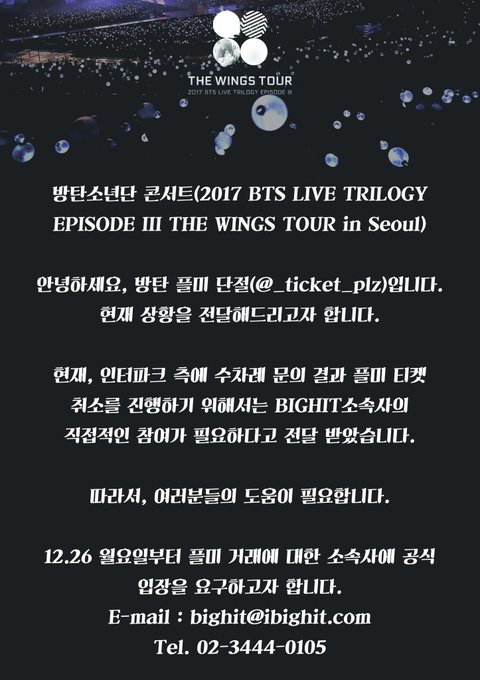 나 어차피 이번에 못가 하고 넘겨버리면... 아마 다음번 콘서트때에 이삐들이 가려고 해도 플미충때문에 못가는 경우가 생길지도 몰라 암표상이나 플미충이 울 애들 공연으로 장사하는 게 말이돼??? 그돈 아껴서 애들 앨범하나라도 더 사는게 맞지 이삐들의 많은 참여 부탁해 메일 전화 열심히 해서 우리 이번 윙콘 꼭가자!!!!!