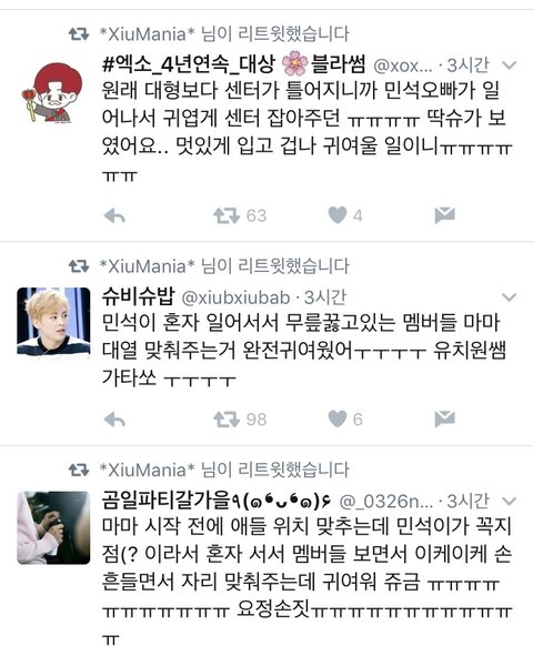민석이형이 맨앞에서 허리 손하고 정렬 맞춰주는데 딱슈같았다구ㅠㅠㅠㅠ기여워주글뻔해쪄 정말로