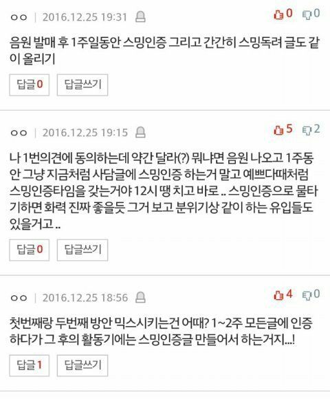 2. 모든 게시글에 꼬박꼬박 스밍인증 하는거 말고, 예쁘다때처럼 음원 나온 날에 바로 '게시글 물타기' 로 스밍인증 글만 올리자.