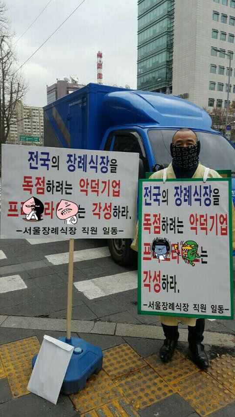 지금 이 추운 날씨에 밖에서 홀로 시위하시는 아빠를 도울 수 없어 여러분들께 힘을 빌려보고자 합니다. 작은 관심이 장례식장의 직원들과 그 가정을 도울 수 있어요…… 공유 부탁드립니다. 친구 가족 누구에게든 공유해주시면 감사하겠습니다… 많은사람들이 이 상황을 알수 있도록