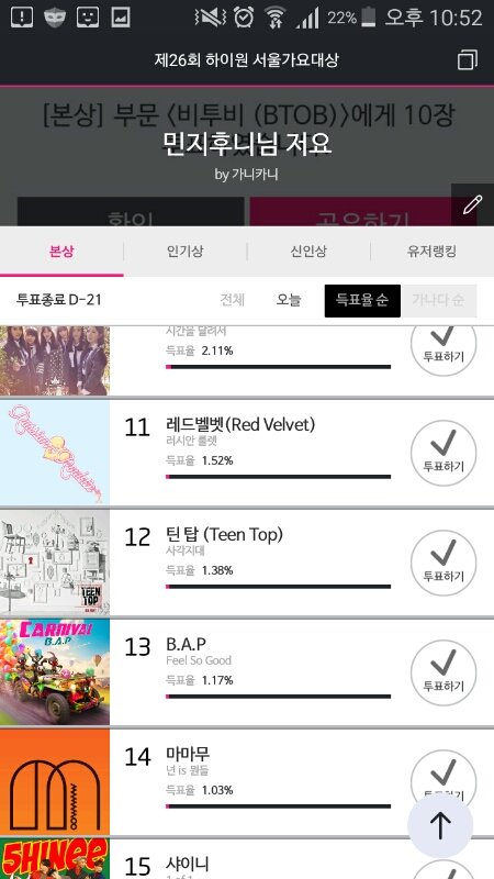 투...투표돔 해줘...... 오늘 투표순위 13위임................ 해줘...해.....줘 파이팅 베이비들 우린 할 수 있다 우리 이대로 떨어지면 왜 여태 올라왔냐ㅠㅠㅠ 아깝자나