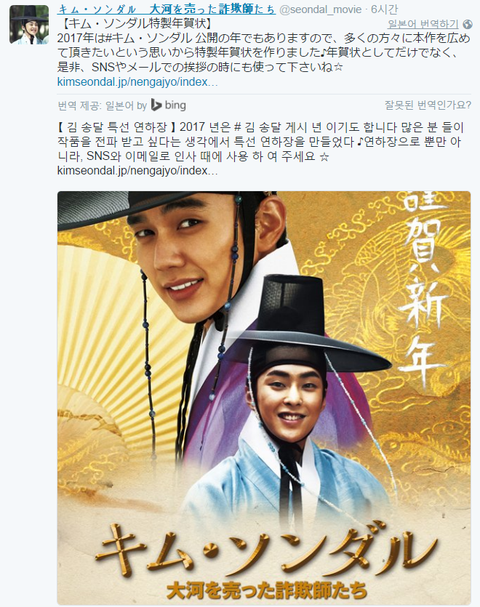 지금 트윗에서 본건데 일본에서 김선달 연하장도 만들어서 올렸네 영화홍보 나름 열심히 하나봐 2017년 1월 20일부터 전국 순차 공개한다고 써 있는 거 같은데 일본분들 많이 보셨으면 좋겠음 김선달 슈이팅! 견이 슈이팅!!!!!