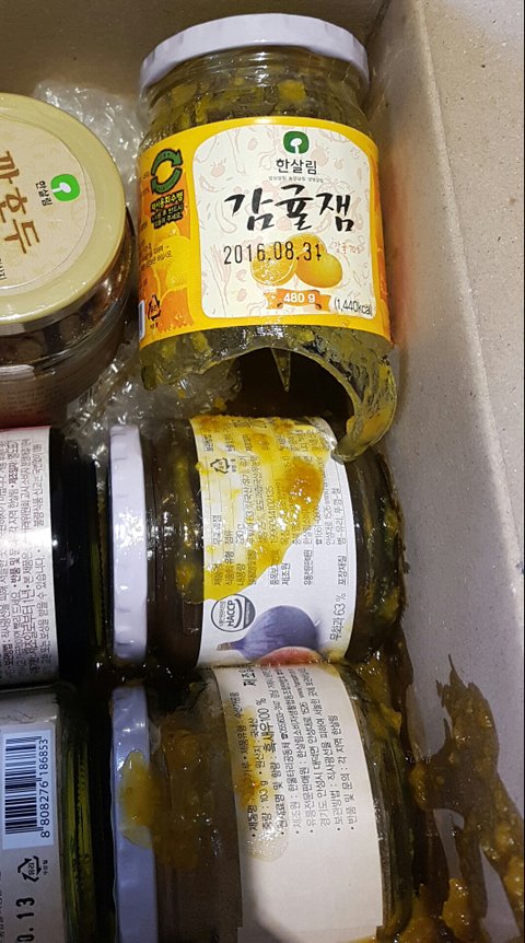 잼 병 하나가 밑바닥이 깨져서 박스안이 내용물로 엉망이 되었고..이건 누가봐도 배송중에 일어난 일이다 생각도 들었구요. 택배박스 겉표지엔 파손주의라고 스티커까지 붙여져있습니다 신기한건 택배박스 겉표지는 이상 없구요..