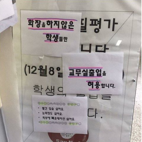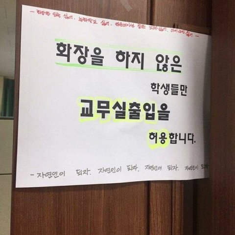 솔직히 학교에서 화장 단속한다는건 잘못 된거라고 생각해.화장한 사람을 죄인인마냥 벌점주고 혼내고. 화장하는 애들 다 날라리 일진이라는거 다 ㄱ소리 같음 다른 학교는 모르겠지만 전교1등 우리반인데 할거 다하더라. 비교하고 싶진 않은데 미국같은 나라 학교에서 화장단속 안하잖아?자기 얼굴 자기가 가꾼다는ㄴ데.