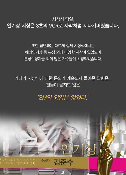 어차피 서가대 공정성 제로 아니었나 ㅋㅋ 작년 인기상도 투표 백퍼로 뽑히는거라 아예 없던일로는 못하겠고, 김준수만 참석자에 쏙 빼고 VCR로 퉁친거 ㅈㄴ ㅋㅋㅋㅋ개코메디ㅋㅋ시바 밑에 자막깔듯 3초 내보냄ㅋㅋㅋㅋ개셈 무서워서 벌벌 떨다가 결국 이꼬라지 됐네 꼴좋다
