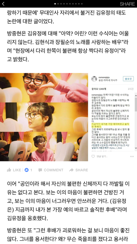 추가글 +)) 댓글 봤는데 난 진짜 아직도 이렇게 까대는 이유를 모르겠다 솔직히 전부터 김유정 인성논란 많은건 알는데 너희가 얘랑 친구도 아니고 막 진짜 얘랑 친한애들한테 무슨 소리를 들은것도 아니고 그냥 연예인들하고 네티즌들 사이에서 함부로 인성 판단 하지 말자 너희는 그럼 얼마나 집에서 일자 다리하고 손톱도 안 쳐다보길래 김유정만 유독 까내리는거냐고 그냥 난 너희가 김유정을 질투하는거나 싫어하는걸로밖에 안보여 어른들 앞에서 착한척?그걸 누가 알아 김유정 진짜 성격인지...만약 너희 딸이 남에 인해 쓰러지고 스트레스 받으면 좋겠어?? 너희 미래 자식들이 단지 사실이 아닌 루머들로 남들한테 욕 먹고 괴로워 하면 좋겠어? 그렇게 생각해봐 김유정이 짝다리하고 손톱 본건 나이에 비해 예의가 없는건 인정하지만 너희는 너무 심하게 까내리고 그렇게 따지면 김유정보가 시사회에서 훨씬 더 자세 안바른 사람들 많아;; 단지 김유정이니깐 더 이슈 만들려 하는거 아닌가? 그만하자 여기서ㅋㅋ너희 앞가림이나 잘해