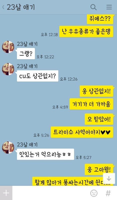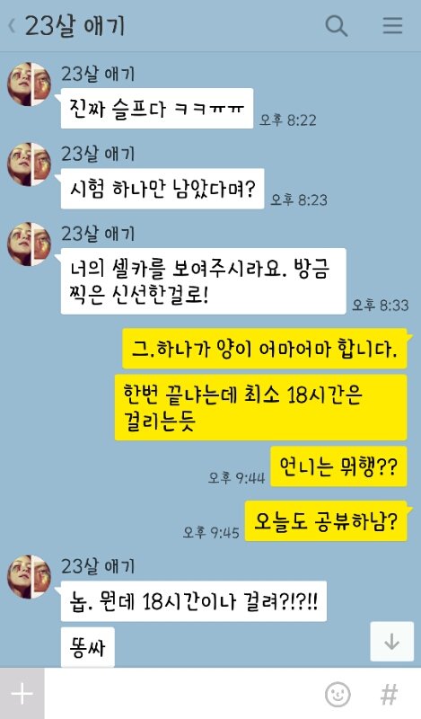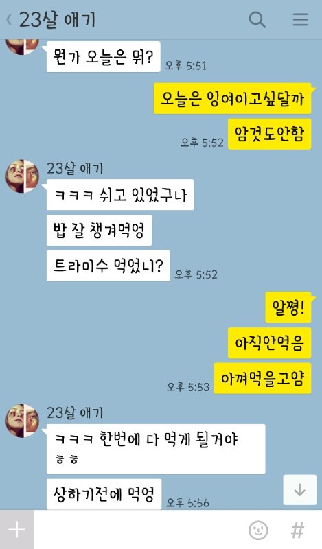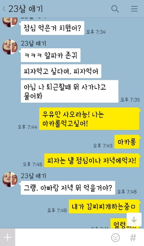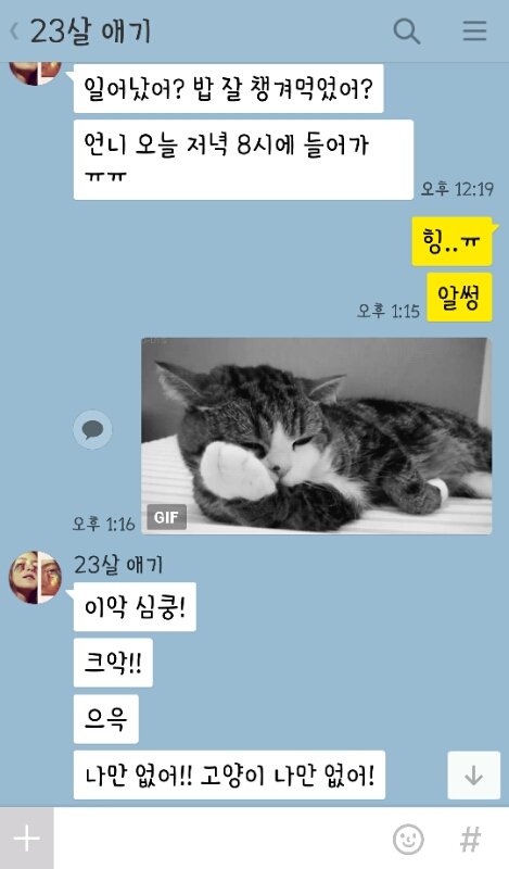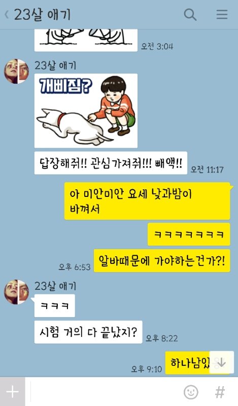 이건 나 방학때 집에만 있는데 뭐하는지 궁금한가봄. 계속 카톡옴. 자꾸 뭐먹었는지 물어봄ㅋㅋㅋㅋㅋ