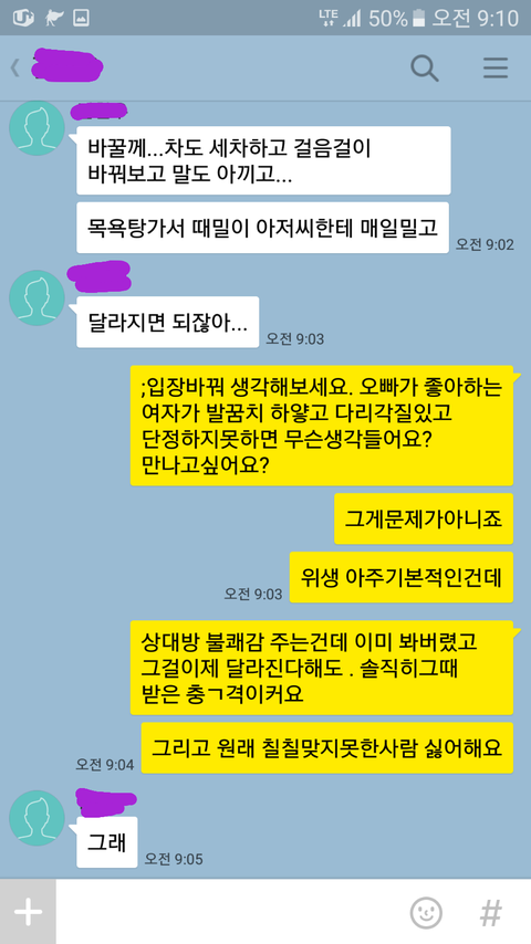 나: 근데 왜그렇게 말을해. 오빠. 위생은 기본인거야. 사람 만나는 예의라고.