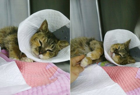 딱히 줄수있는게 식당에서 나오는 고기반찬 밖에 없었다고 저 아이를 살릴수있다면 꼭 살려달라는 식당 종업원의 말과 구조에 도움을 주셔서 포획에 성공하였고 한다름에 병원에 달려 갈수있게 되었습니다.