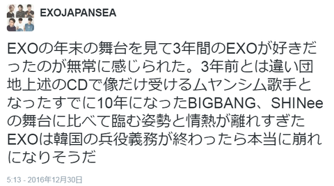 EXO의 연말의 무대를 보고 3년간 EXO가 좋아했던 것이 허무하게 느껴졌다. 3년 전과 달리 단지, 상술 CD로 상만 받는 무양심 가수가 됐다. 이미 10년 된 BIGBANG, SHINee의 무대에 비해서 임하는 자세와 열정이 너무 떨어졌다. EXO는 한국의 병역 의무가 끝나면 정말 붕괴가 될 것 같다.