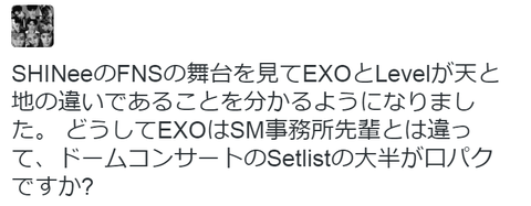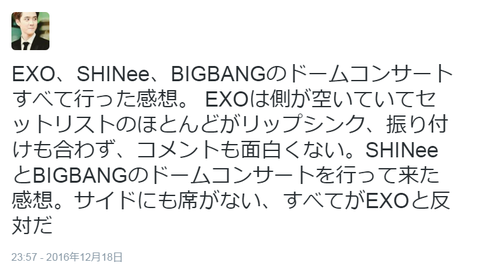 EXO의 연말의 무대를 보고 3년간 EXO가 좋아했던 것이 허무하게 느껴졌다. 3년 전과 달리 단지, 상술 CD로 상만 받는 무양심 가수가 됐다. 이미 10년 된 BIGBANG, SHINee의 무대에 비해서 임하는 자세와 열정이 너무 떨어졌다. EXO는 한국의 병역 의무가 끝나면 정말 붕괴가 될 것 같다.