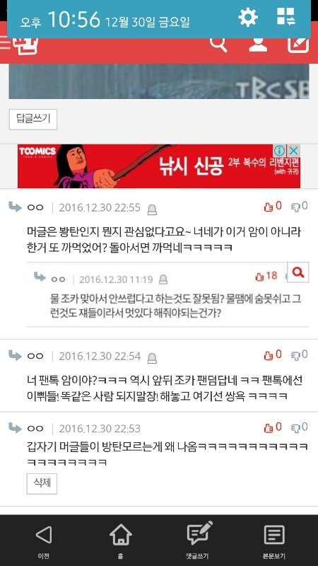 ㅋㅋㅋㅋㅋㅋㅋ대댓글 보다가 이런 거 있길래 갑자기 팬톡얘길 하질 않나 머글ㅇ들은 방탄 모른다는 얘길 하지않나 ㅠㅠㅠㅠㅠ혹시 이삐톡으로 옮겨야되면 말해줘.ㅠ너무 화나서