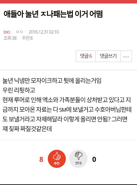 지금까지 수호와 아버지를비롯한 가족들이받은 수많은 상처들을 무시할 수 없으며, 엑소엘은 그들에게 또 한번 상처를 내려는 악플러들을 두고볼 수 없기에 지금까지 모아온 모든 자료들을 SM 법무팀에 보내고, 수호아버님께 전달하려합니다. 가족을 건들면서까지 엑소에게 안좋은감정을 드러내는것은 자제해주시길 바랍 아 시 발갑자기 쓰기존 나귀찮다