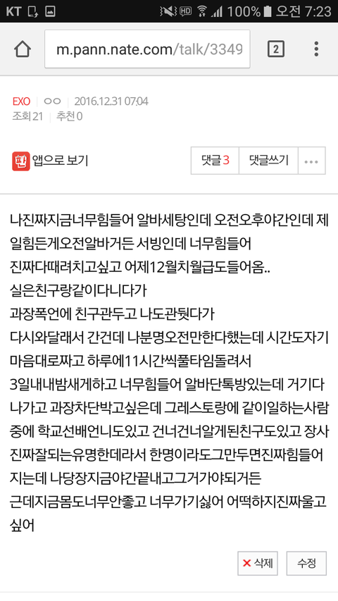 단톡다나가고 차단했다..안나갈거야 무책임한거알지만 도저히안될거같아 조언해준애들모두고마워 너네말처럼 그냥하루만쉬거나 강하게나가는방법이더좋았을텐데 나 겁이많아서 도저히못하겠더라..ㅜㅜ..스밍은 공기계로돌리는중이야 지금알바중인데 공기계는집에있어서..