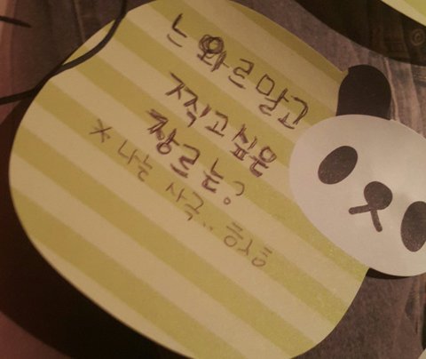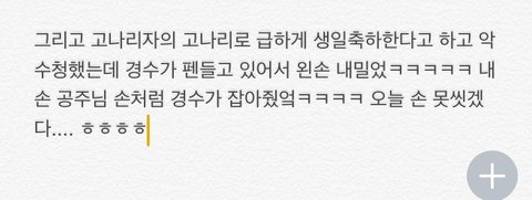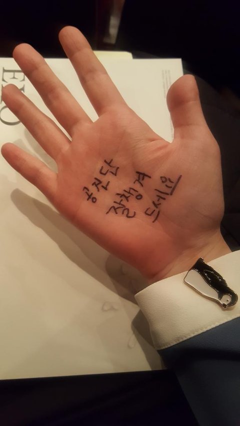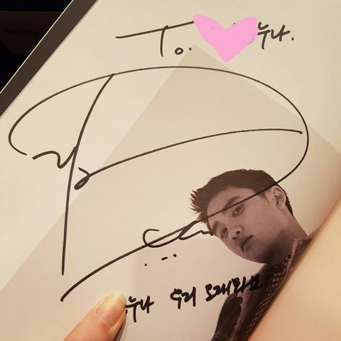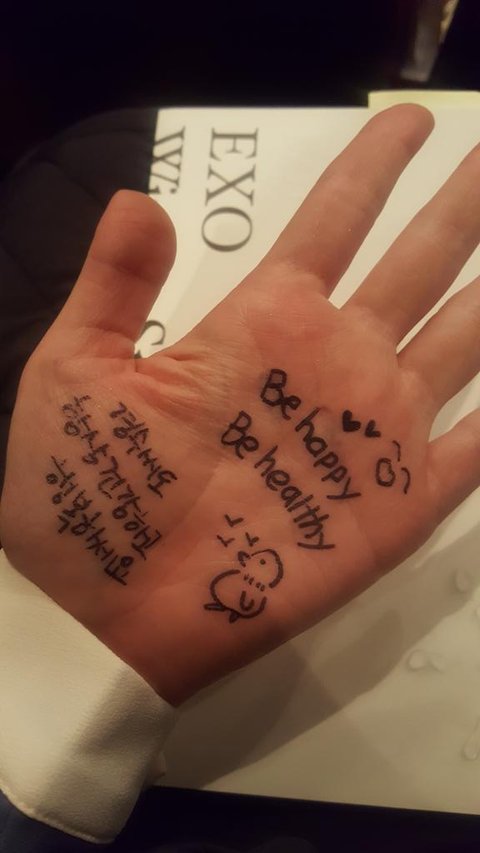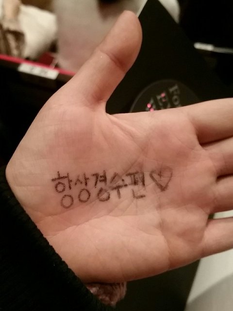 팬싸 떨려서 말 못할까봐 손바닥에 적어갔는데 왼손엔 똑바로 잘 적고 오른손엔 반대손이라 힘들어서 삐뚤빼뚤 적어갔더니 경수가 보고선 푸핫!!!⌒♡⌒ 하고 빵터졌어 세상에서 제일 예쁘고 소중한 아기펭귄 웃음이었다ㅠㅠㅠㅠ