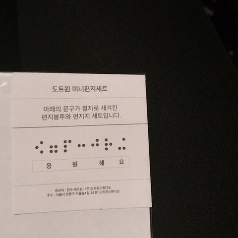 경수한테 점자로 응원해요가 써있는 편지지에 편지를 담아서 싸인받을때 줬는데 이거 응원해요 라고 써있는거예요 라고 하니까 "근데 제가 이걸 읽지는 못해서.." 하길래 마음의 눈으로 읽어주세요 했더니 아하핫 알겠습니다 ⊙♡⊙ 했어요
