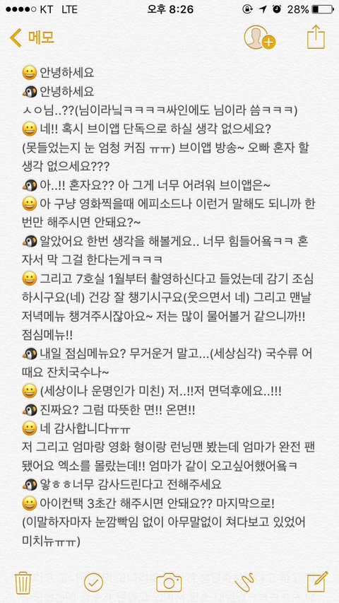 님 아니구 누나라니까 님 엑스하구 누나라구ㅠ하트하트해주고ㅠㅠP.S로 경수 이모티콘 그려달라하니까 아 이건 또 제가 잘그리죠⊙♡⊙ 하면서 제일잘그려주고ㅠㅠ2017년에두 경수 많이많이 보고싶다구하니까 우리 많이봐요 화이팅!해주면서 손 꼭잡아주써ㅠㅠ고마어