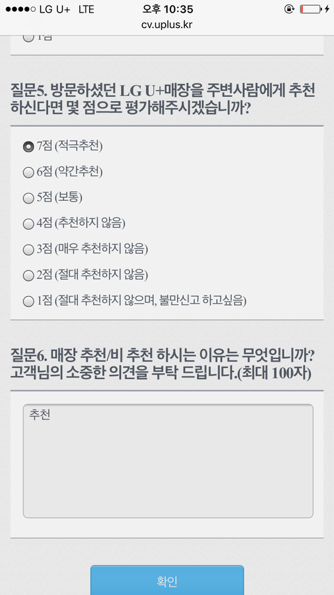 저는 설문에 응한적이 없어서 뒤로가기를 누르니까 다 7점을 주고 추천을 누른 설문조사가 뜨더군요.