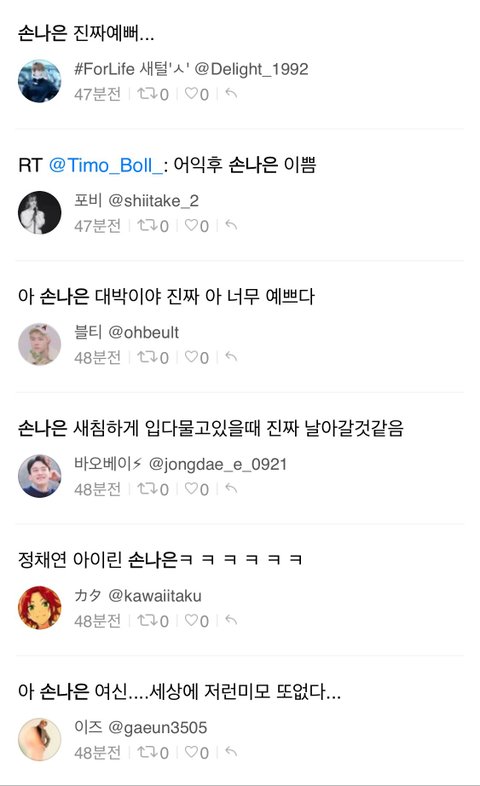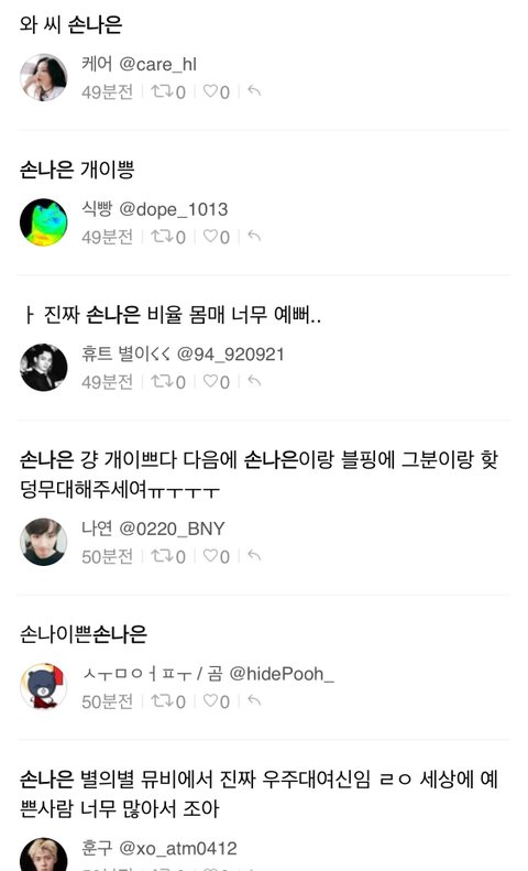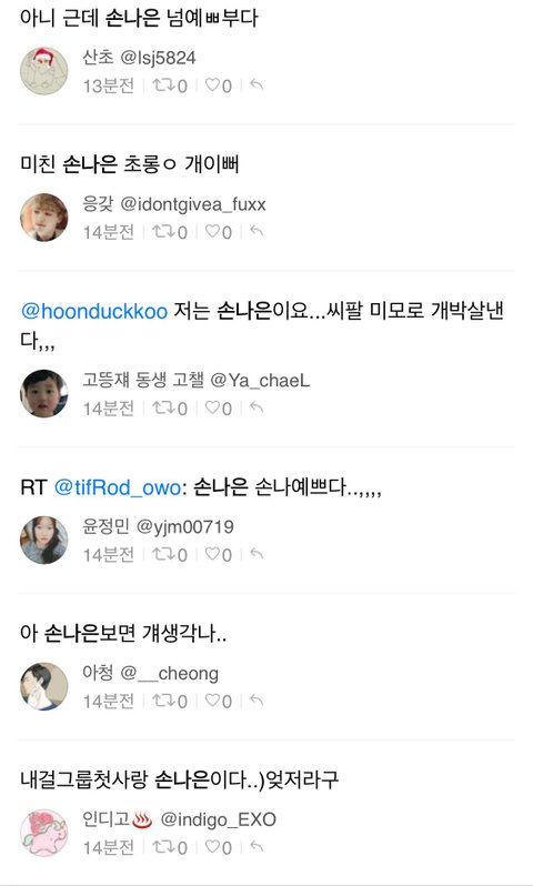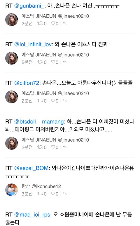 까려고 이악물고 단점찾고 티눈찾으려 안달난 몇빼고 거의다 손나은 미모몸매보면 헉하지 거기다 인성도 바르고 똑똑하고 깔게 없음 행동말 함부로 하지얂는 바른생활여돌