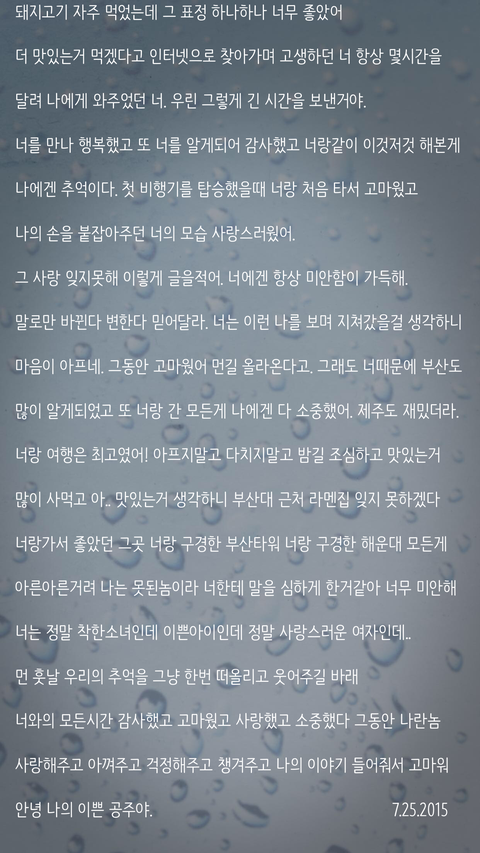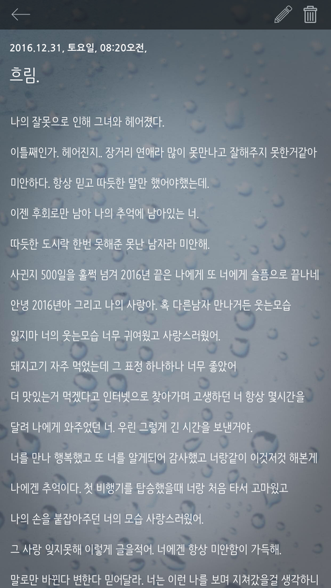 새복많이받으라고. 2017년에는 너에게 큰 행복이 오기를 기도할게. 내가 제일 사랑했던 너 그동안 많이 슬프고 힘들었지. 못난 남자친구 오래 사랑해줘서 고맙고 감사해 안녕 새복많이받고 정말 많이 사랑했다. 이젠 안녕이겠지..