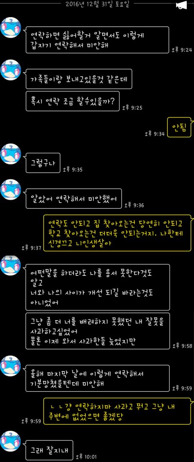 몰래 집앞도 오고 학교도 왔ㅇ었다고함 진짜..졸라 무섭;;;어제는 뭔 사과하고 싶다고 톡까지 했다는데 개찌질 그 자체다ㅋㅋㅋ있을때 잘하지 헤어진뒤에 사과는 왜함 ㅋㅋㅋ프사부터ㅏ 무슨 찐따처럼 만화 케릭터 해놨음 ㅋㅋㅋ
