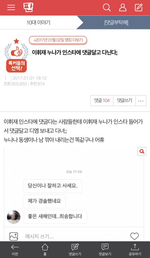 이휘재 인스타에 댓글다는 사람들한테 이휘재 누나가 인스타 들어가서 댓글달고 디엠 보내고 다녀;;
