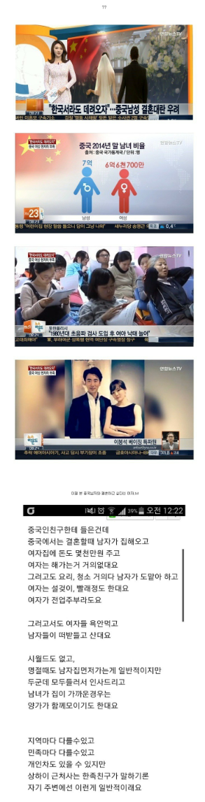 중국남 만나는게답. 중국남은 도태될까 두려워 여자떠받들고 사는데 한남충은 도태될까 두려워 남자외모나 능력보면 김치녀거림. 돈이없으면 그냥도태되면된다 한남충아
