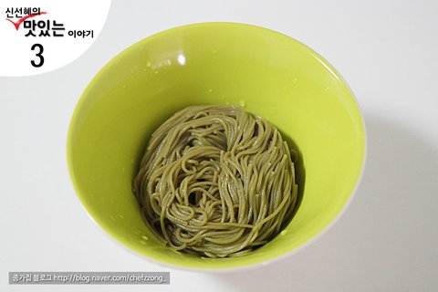 2. 잘 삶아진 소면을 둥글게 둥글게 말아서 이쁘게 그릇에 담아주세요.이때 미리 썰어둔 고명을 함께 담아주면 끝!