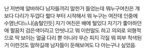 재작년에 직장 동료들이랑 망년회라서 술 한잔 마시고 있었는데 망년회라서 그런지 모르겠는데 사람들이 좀 있었음. 다른 사람들 말 소리 때문에 우리 하는 말도 잘 안 들리고 그랬지만 그래도 망년회 분위기고 하니까 신나서 서로 술 한잔씩 하고 있었는데 내 기준으로 왼쪽 테이블 쪽 남자 대학생(?)들이 우루루 모여서 자기 여친들 흉을 보는데 자기 여자 친구는 얼굴은 이뻐서 사겼는데 잠자리까지 가서 몸을 벗겨 보니 뭐 배가 나왔다느니 생각보다 가슴이 작다느니 이런 말들이 나와서 듣기가 거북했음. 더군다나 그 때 당시 우리 테이블에 여직원들도 몇 명 있었는데 그 소리 들으면서 여직원들 분위기가 별로 안 좋다는 걸 느꼈음. 그래서 그 때 그 술집에 들어온지 시간이 꽤 지나서 분위기도 전환 할 겸 2차로 다른 술집으로 옮긴 기억이 있는데 나도 남자지만 남자들이 저런 소리 할 때마다 정말 부끄러운 생각 밖에 안 들더라. 혹시라도 내 여동생이 저딴 남자 애들한테 걸리면 어쩌지? 라는 생각이 들기도 했고... 그래서 여성분들 남자 사귈 때 잘 보고 사귀세요. 안 그러면 진짜 심심풀이 땅콩처럼 저렇게 뒤에서 흉 보는 남자들 꽤 있으니까요.