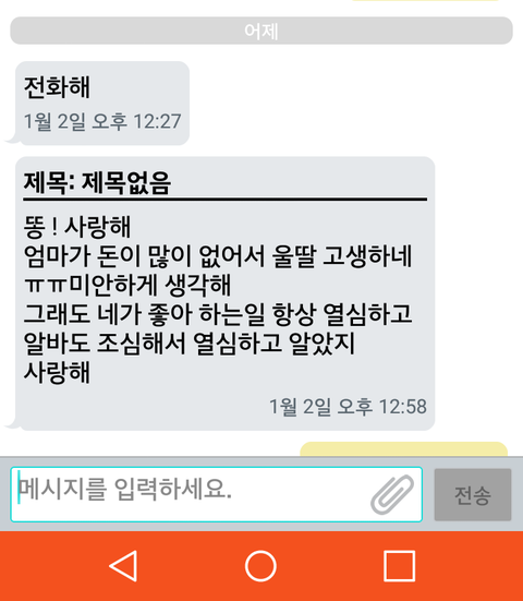 그렇게 우울한 알바를 끝마치고 터미널에서 버스 기다리고있는데 엄마한테 문자가 와있더라고.