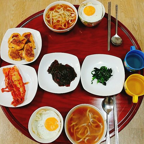 중국식 삥&김치&깻잎장아찌&시금치&계란밥&우동