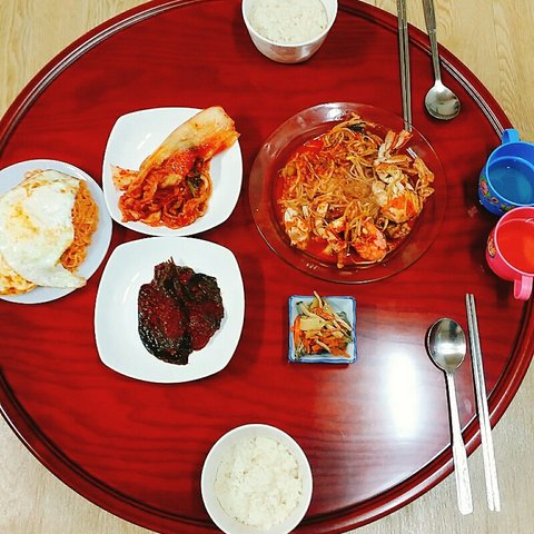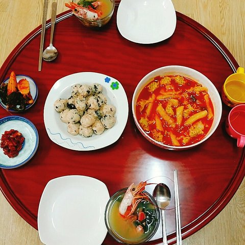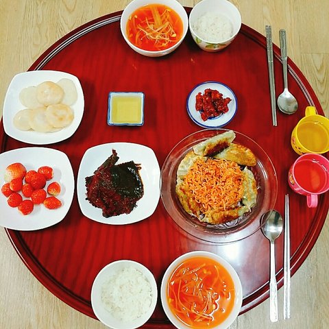 떡&딸기&낙지젓갈&깻잎장아찌&만두&비빔면&콩나물무우국