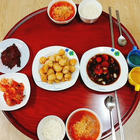 깻잎장아찌&배추김치&오징어볼&탕수소스&라면