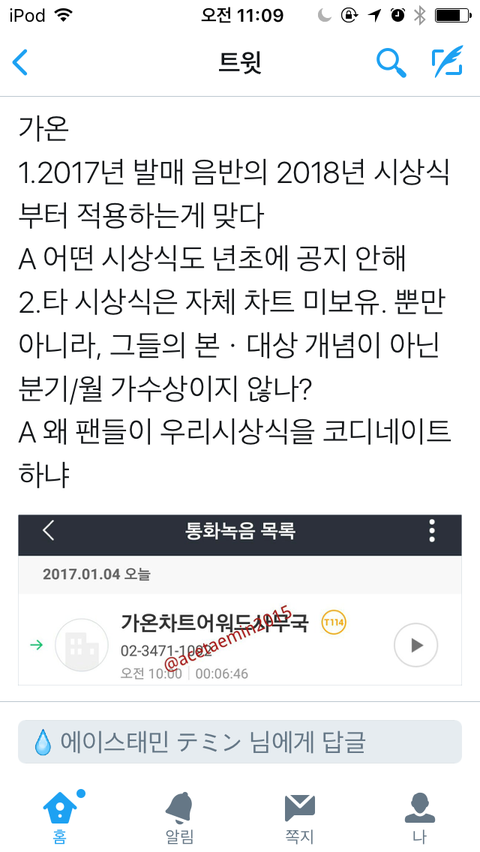 ++) 샤이니 팬이 가온한테 직접 전화해서 물어본거 짹에서 캡해왔어! (판에서도 알아야 할것같아서ㅠㅠ) 이렇게 무책임한 발언하는 가온 엿먹어라