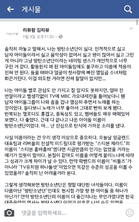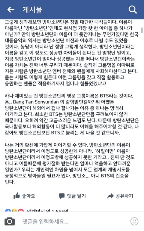 요약하자면 애들 그룹명이 더 멋졌으면 방탄이 지금보다 더 엄청엄청난 아이돌이 됐을거란 얘기임ㅇㅅㅇ 애들그룹명은 싫은데 애들은 참멋지다 이런거같은데 난 그룹명 맘에드는데ㅜ 근데 이름때문에 편견가지는 사람 많은건 정말 반박불가...