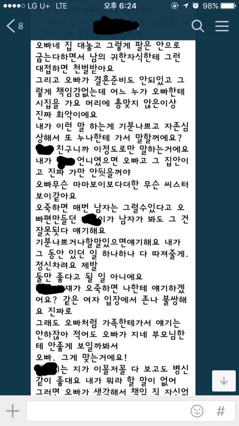 남자친구의 행동에 제 친구도 화가나서 한소리했습니다. 그러면서 누나가 싸운걸로 이야기하는거랑 뭐가 틀리냐고 하니깐 차라리 가족한테 욕듣는게 낫다고 자기같으면 쓴소리해도 다 참는다고 한답니다.