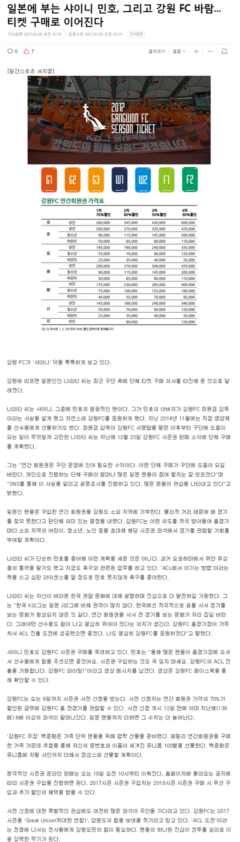 일본에 부는 샤이니 민호, 그리고 강원 FC 바람...티켓 구매로 이어진다