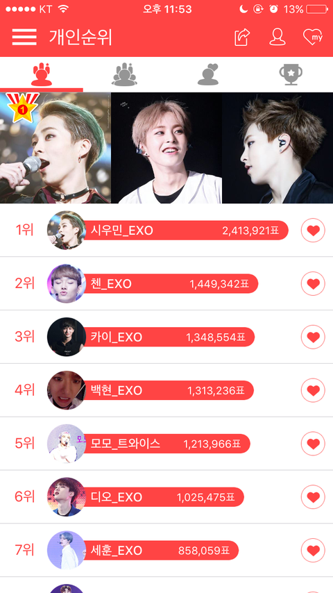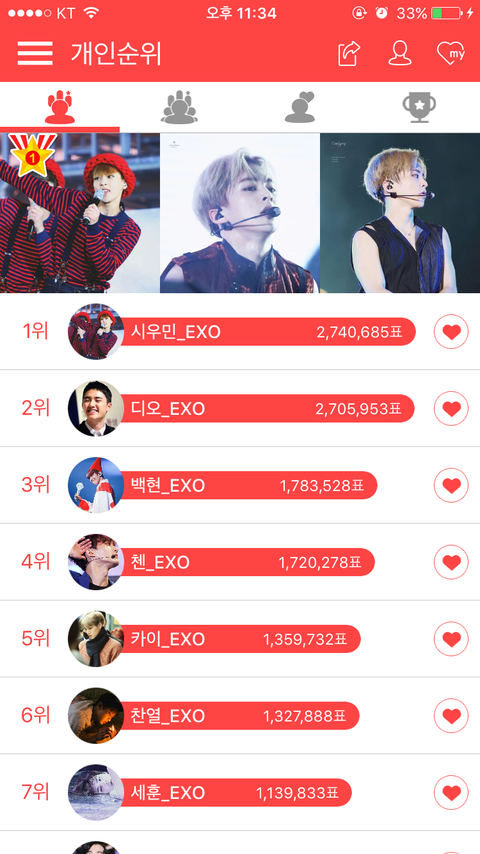 시우민 밑은 맨날 업치락 뒷치락 인듯 순위 별 의미 없어보인다