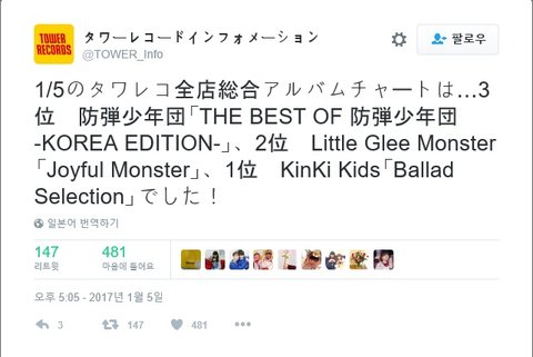 1/5 타워레코드 전 점포 종합 앨범 차트 ... 3 위 방탄소년단 「 THE BEST OF 방탄소년단-KOREA EDITION-」