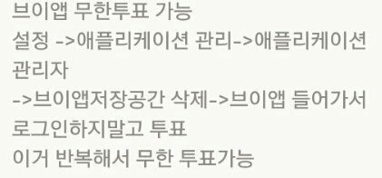 이거 븨앱삭제하거깔고로그인하거 또 삭제하고 깔고 로그인하고 투표하고 이렇게 반복해서 무한투표가능해!!!!한번투표하지말거 이렇게 반복해서 하자!!!!뒤집혔어 ㅜㅜㅜㅜㅜㅜ 어른폰은 이방법으로만 할수있고!!!
