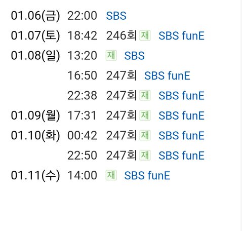 이삐들 오늘방송 재방송표야 저장하고 열툽하자..