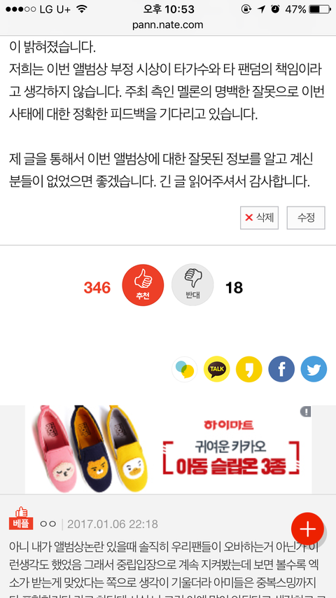 솔직히 어젯밤부터 연간차트 보고 너무 억울하고 아침에 도저히 못 참겠어서 글 올리자고 한건데 너네가 다 나 믿고 기달려줘서 고마움 ㅇㅇ 진짜로 너네가 있어서 이렇게 많은 사람들이 앨범상 관련된 진실을 알 수 있었음 고맙다 오글거려서 더 이상 이쁜 말은 못하겠고 톡선이랑 댓글 관리 잘하고 벽반 때 혹시라도 피드백 저쪽에서 올릴 수 있으니까 우리는 제대로 반박할 준비하자 파이팅